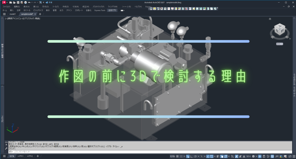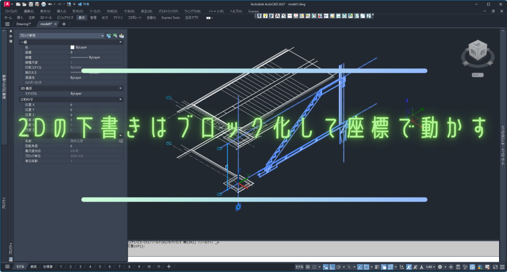 斜めのモデルを作成する場合は、ブロックを活用すると作業効率と管理性が大きく向上します。 まず、ブロック化したモデルをコピーし、コピーした方を3D位置合わせコマン... -