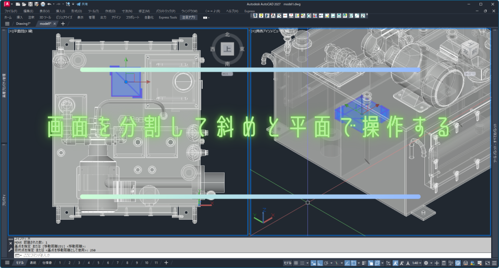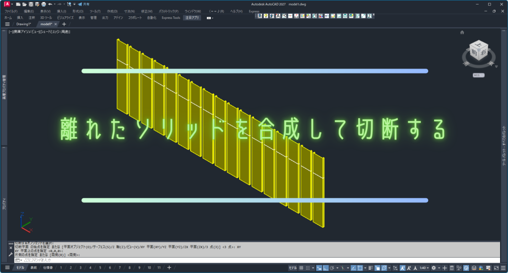 斜めのモデルを作成する場合は、ブロックを活用すると作業効率と管理性が大きく向上します。 まず、ブロック化したモデルをコピーし、コピーした方を3D位置合わせコマン...