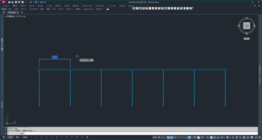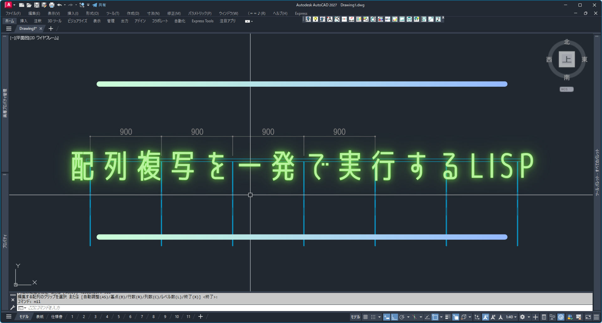 (command "_.ARRAYRECT" ss "" "" "1" "4" "S" "900" "")このLISPでは、(ssget) を使ってオブジェクトを選択し、ARRAYRECT コマンドで矩形配列を実行しています。