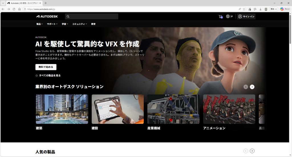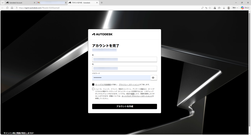 まずはAutodeskの公式サイトにアクセスし、「アカウントを作成」から登録を行います。登録では、メールアドレスや名前、パスワードなどを入力します。