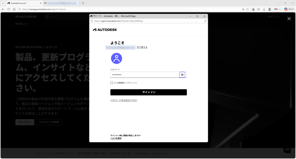 AutoCADをインストールして起動するとログイン画面が表示されるため、作成したアカウントでログインします。サブスクリプションライセンスはこのアカウントに紐付いているため、ログインすることでソフトを利用できます。