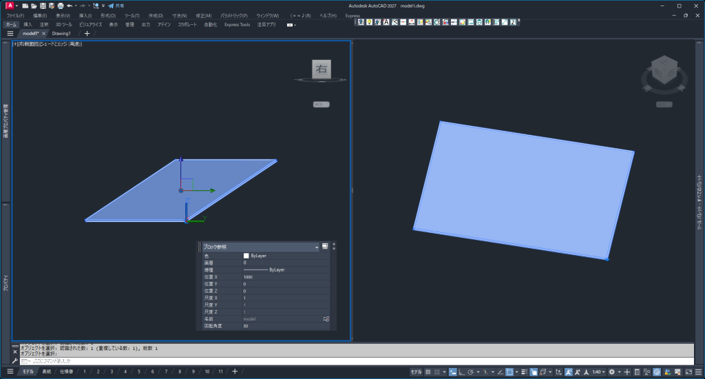 この斜めの編集方法はブロックの向きや角度はブロック外で保存されている特性とブロック内のモデル形状は同名ブロックで共有している特性を利用しています