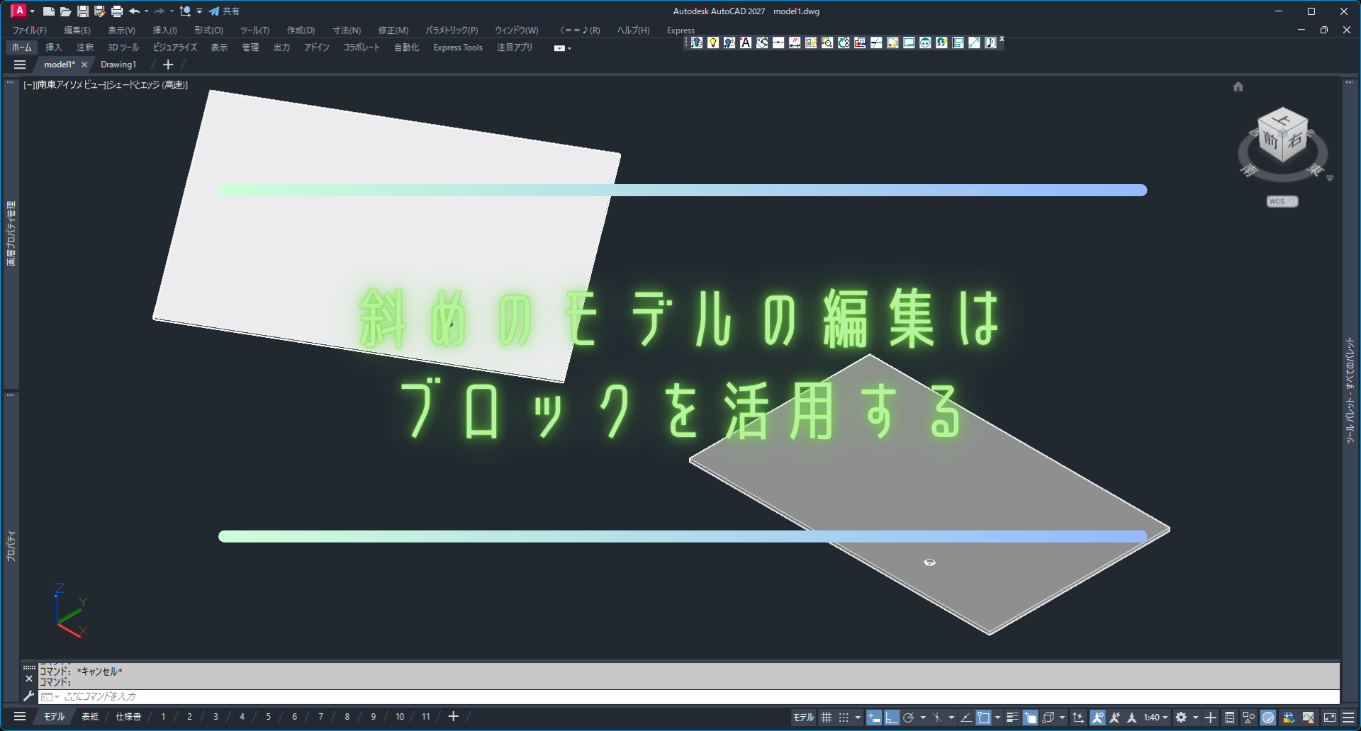 斜めのモデルを作成する場合は、ブロックを活用すると作業効率と管理性が大きく向上します。